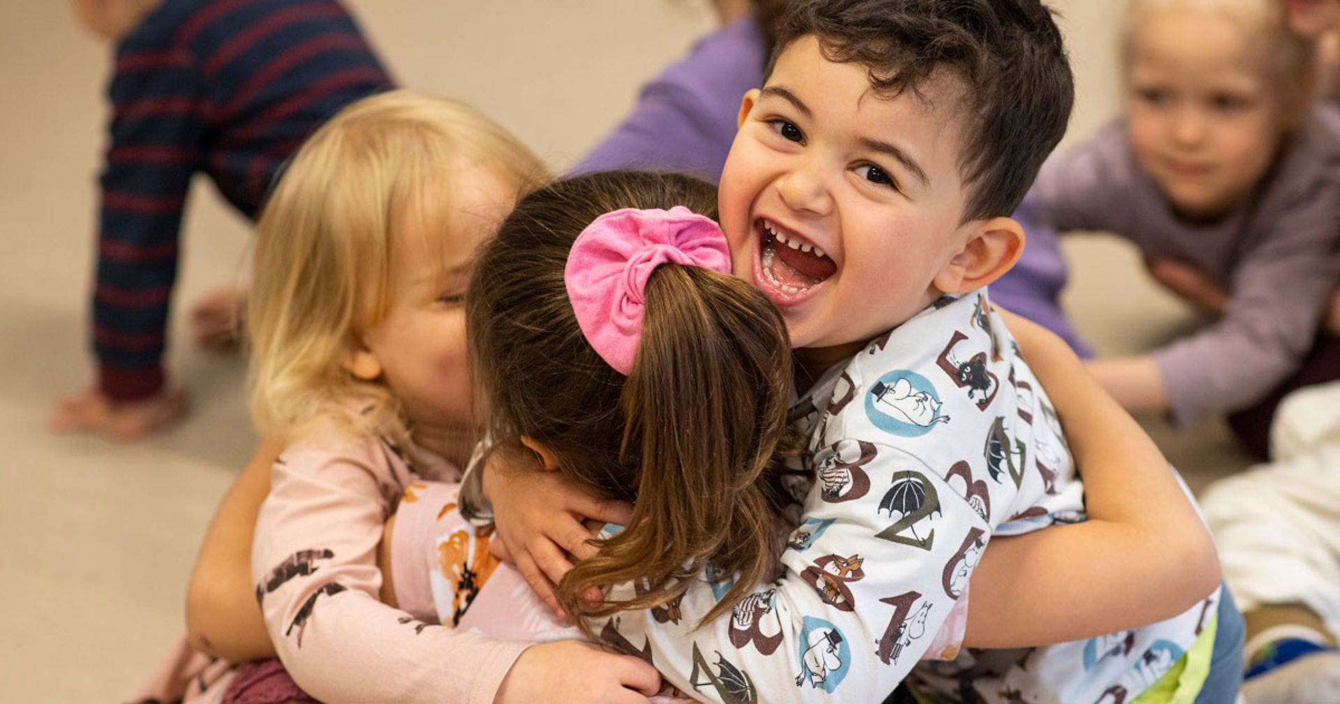 Barnen skrattar när de kramar om flera lekkamrater samtidigt. Snart skrattar grupper på två och tre barn på golvet och kramar varandra hårt. Synen är en sådan som man gärna skulle kopiera till arbetslivet. Närvaro, kompisfärdigheter, självkännedom, medlidande och ensamhet är alla färdigheter som kräver övning oberoende av ålder. Med gemensamma ömhets- och interaktionslekar stärks gruppens sammanhållning.