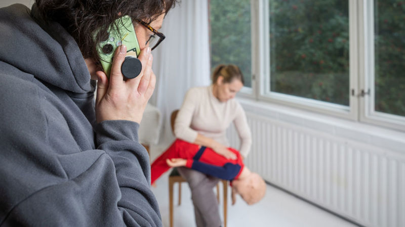 - Om det främmande föremålet fortfarande täpper till luftvägarna, ring 112. Slå på högtalarfunktionen på telefonen och fortsätt ge första hjälpen.