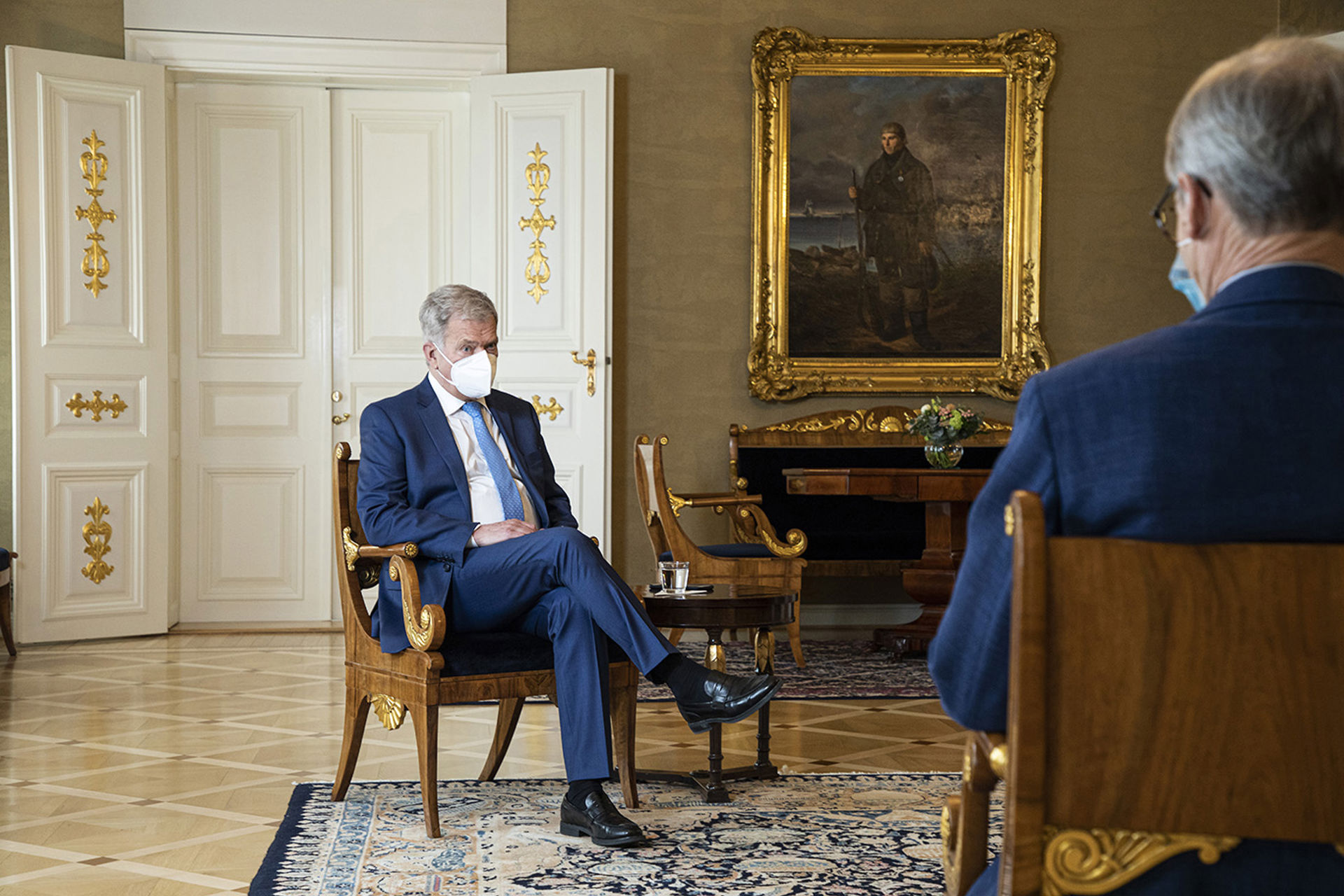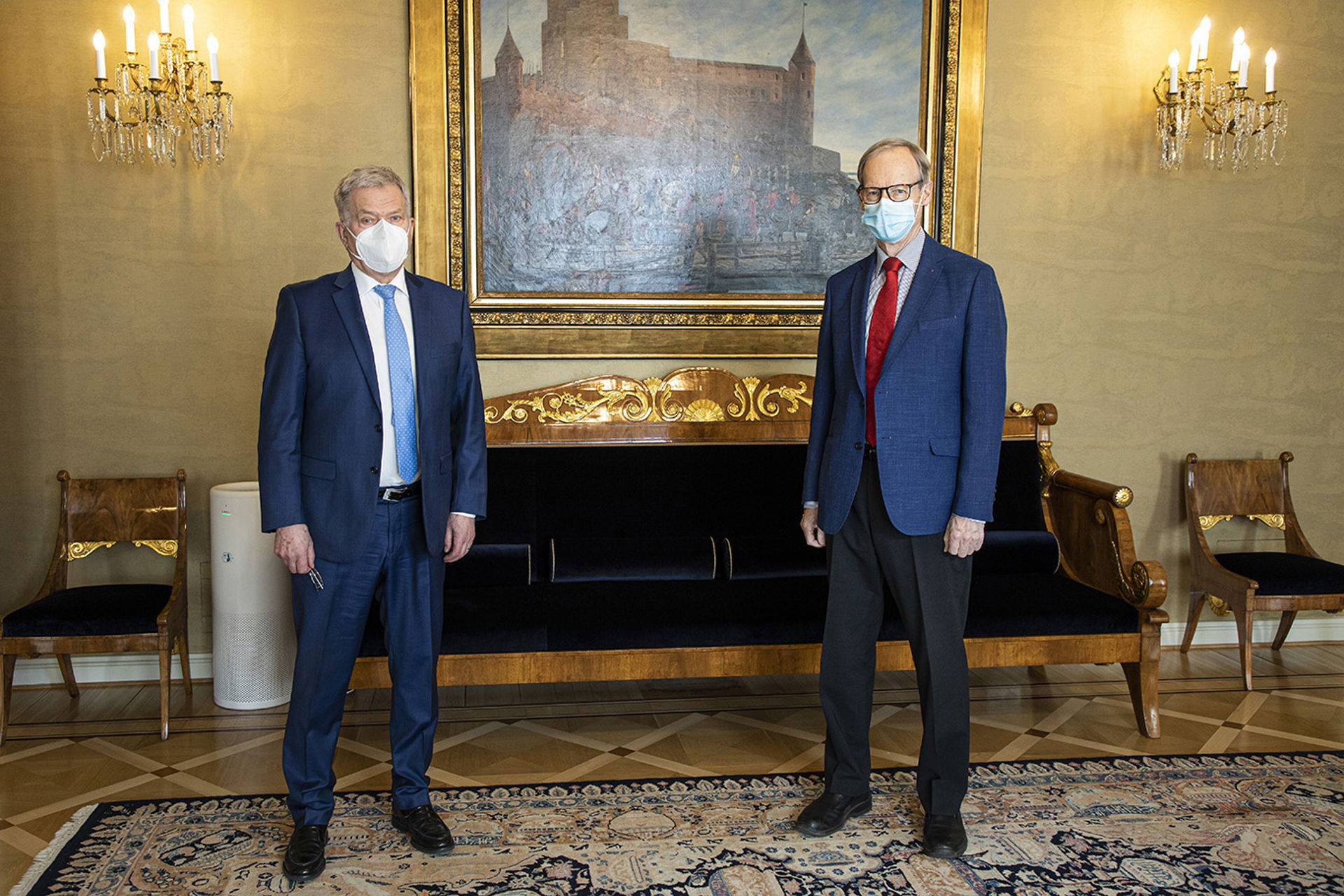 – Att flytta över till Röda Korset öppnade mina ögon för den press som humanitära organisationer lever med i en värld med allt fler kriser, kon-staterar Torstila efter att han och president Niinistö har hälsat på varandra.